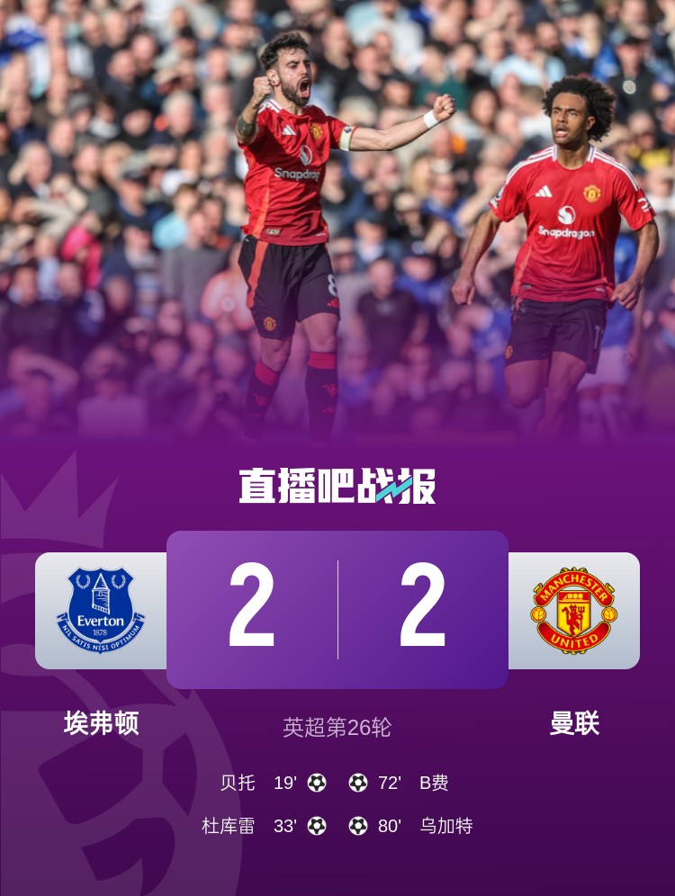 英超聯(lián)賽第26輪,曼聯(lián)2-2戰(zhàn)平埃弗頓,B費(fèi)、烏加特進(jìn)球。
