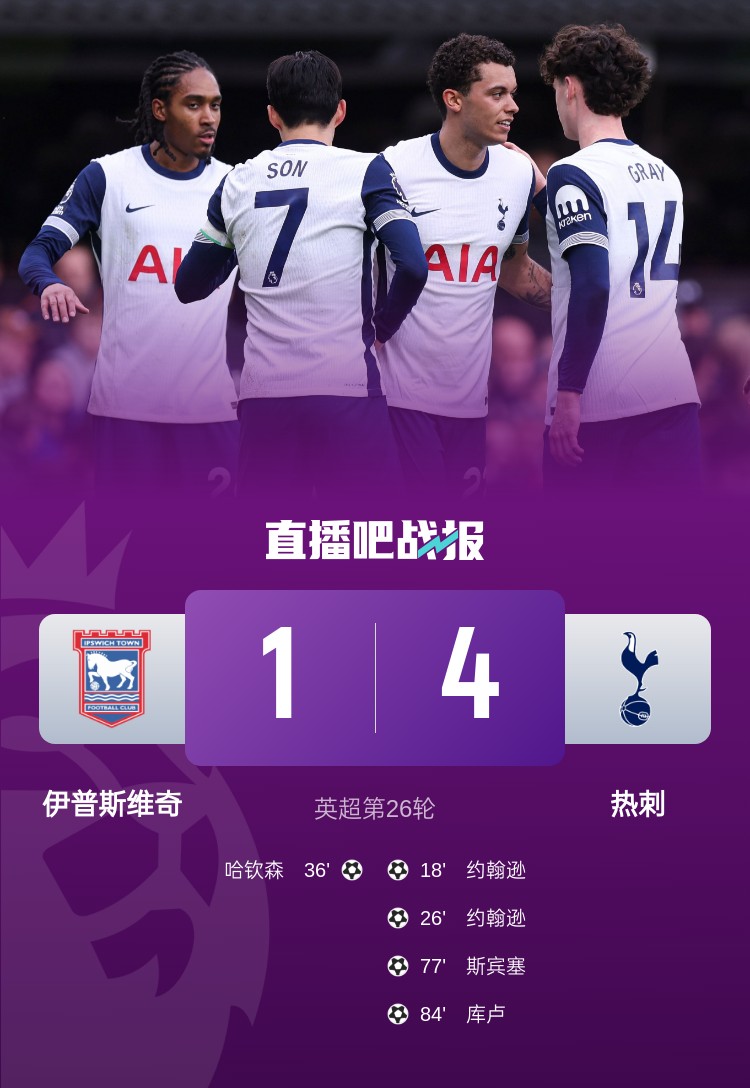 英超第26輪,熱刺客場(chǎng)4-1伊普斯維奇取得三連勝,約翰遜梅開二度。
