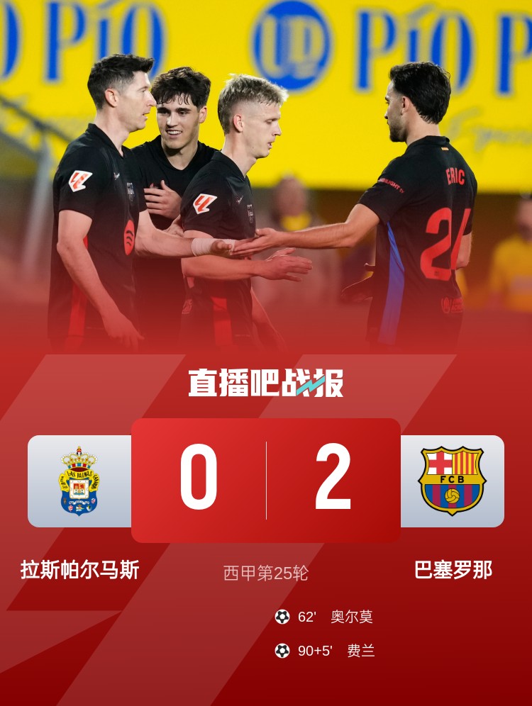 西甲第25輪,巴薩2-0拉斯帕爾馬斯1分優(yōu)勢(shì)領(lǐng)跑,奧爾莫、費(fèi)蘭進(jìn)球。