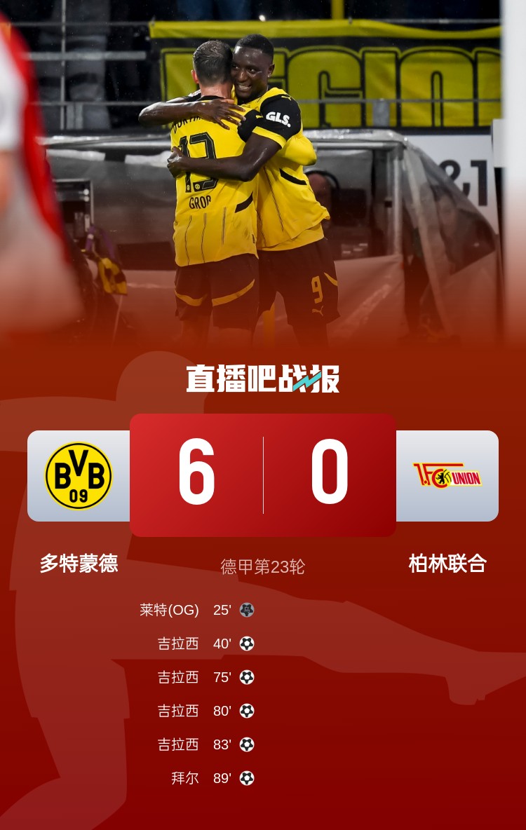 德甲第23輪,多特蒙德6-0大勝柏林聯(lián)合,吉拉西大四喜,格羅斯4次助攻。