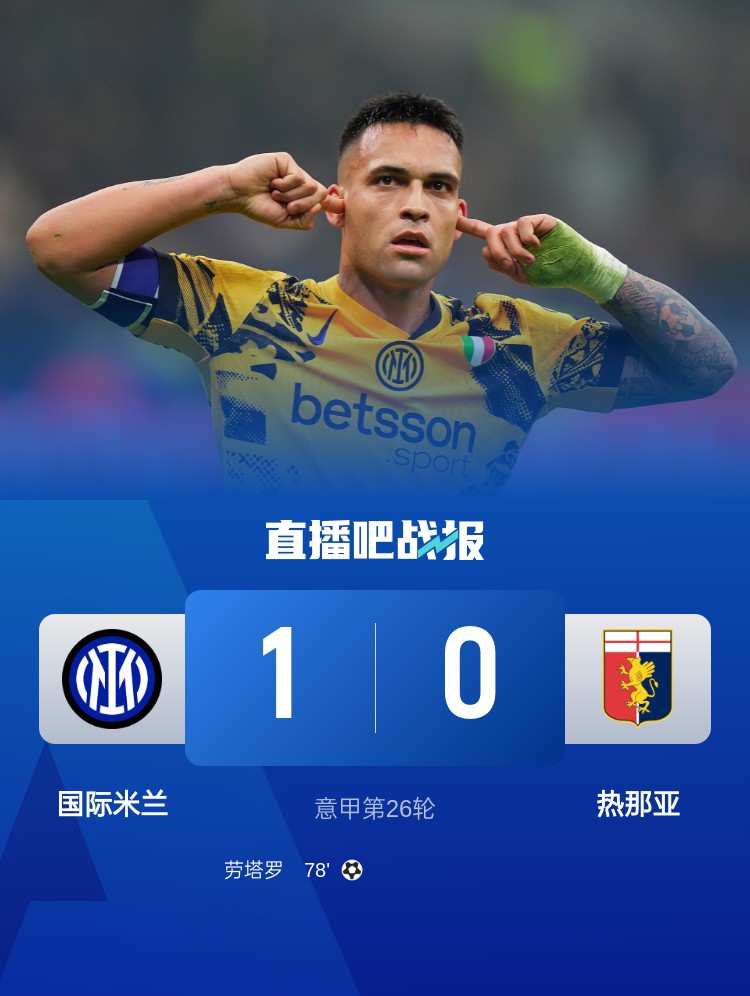 意甲第26輪,國(guó)際米蘭1-0戰(zhàn)勝熱那亞,暫登頂,勞塔羅頭球制勝。