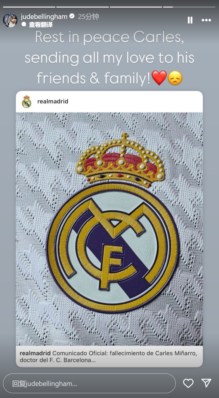 皇馬中場(chǎng)貝林厄姆更新社媒悼念卡萊斯,配文:“R.I.P.卡萊斯,向他的家人朋友致以我所有的愛(ài)?!?/p>