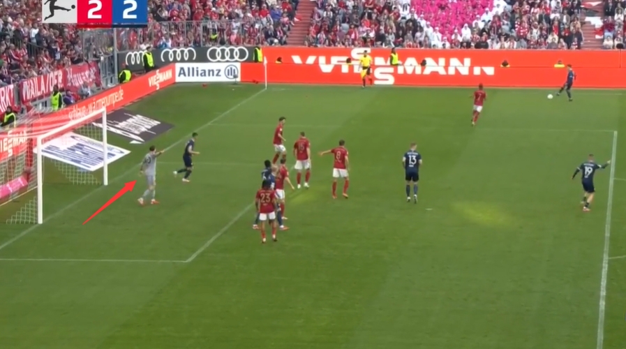 其中拜仁的第二粒丟球,在波鴻起傳中前,烏爾比希就指出了后點(diǎn)的防守隱患,但拜仁無人協(xié)防,博伊在面對波鴻傳中時(shí)冒頂,西索科將球頂進(jìn)球門遠(yuǎn)角。